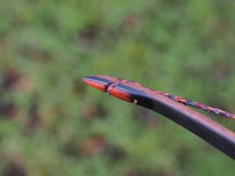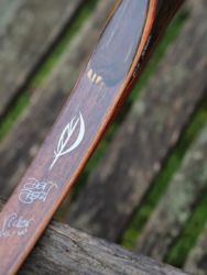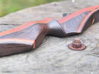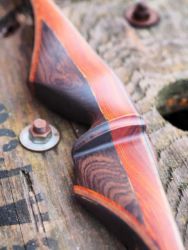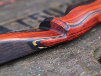 Ich habe Cocobolo und Grenadill verwendet, außerdem Nussbaum in den Wurfarmen. In diese wurde ein schwarzer Verlauf eingebeizt. Die Details sind aus Cocobolo, Grenadill und Schwarz-Weissem Ebenholz. Außerdem ist im Haltebereich und oberhalb des Schussfensters je ein saftiges Stück Blei eingebaut.
